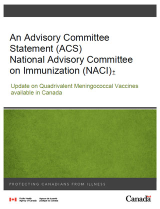 • Review and update information on quadrivalent conjugate meningococcal vaccines and vaccination schedules used in Canada following the approval of a new quadrivalent conjugate meningococcal vaccine Nimenrix (GlaxoSmithKline [GSK]) and of a new age indication for Menactra® (Sanofi Pasteur).