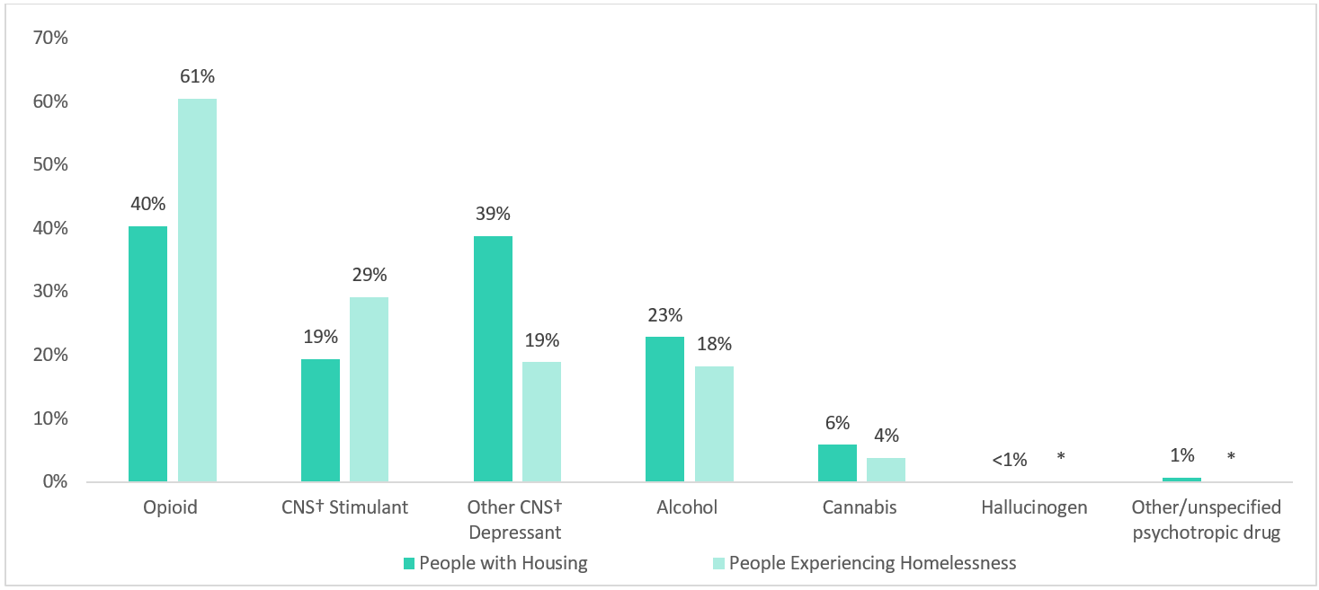 This report found that approximately 6% of hospitalizations for substance-related poisonings (that were primarily from opioids, stimulants, cannabis, alcohol, and other depressants) across the country were among people experiencing homelessness. When compared to people with secure housing, hospitalizations for substance-related poisonings among people experiencing homelessness had a higher proportion of:
