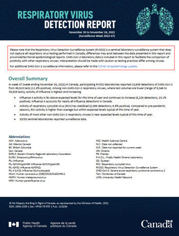 In week 47 (week ending November 26, 2022) in Canada, participating RVDSS laboratories reported 10,639 detections of SARS-CoV-2 from 89,913 tests (11.8% positive). Among non-SARS-CoV-2 respiratory viruses, where test volumes are lower (range of 9,346 to 35,629 tests), activity of influenza is highest and increasing.