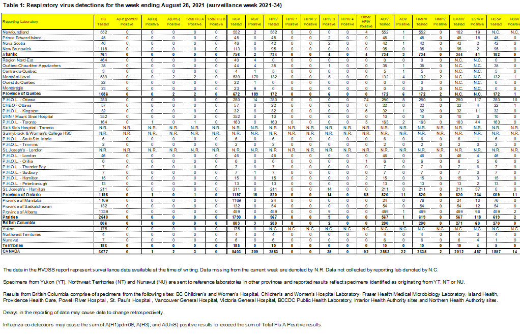 Table 1: Respiratory virus detections for the week ending August 28, 2021 (surveillance week 2021-34)