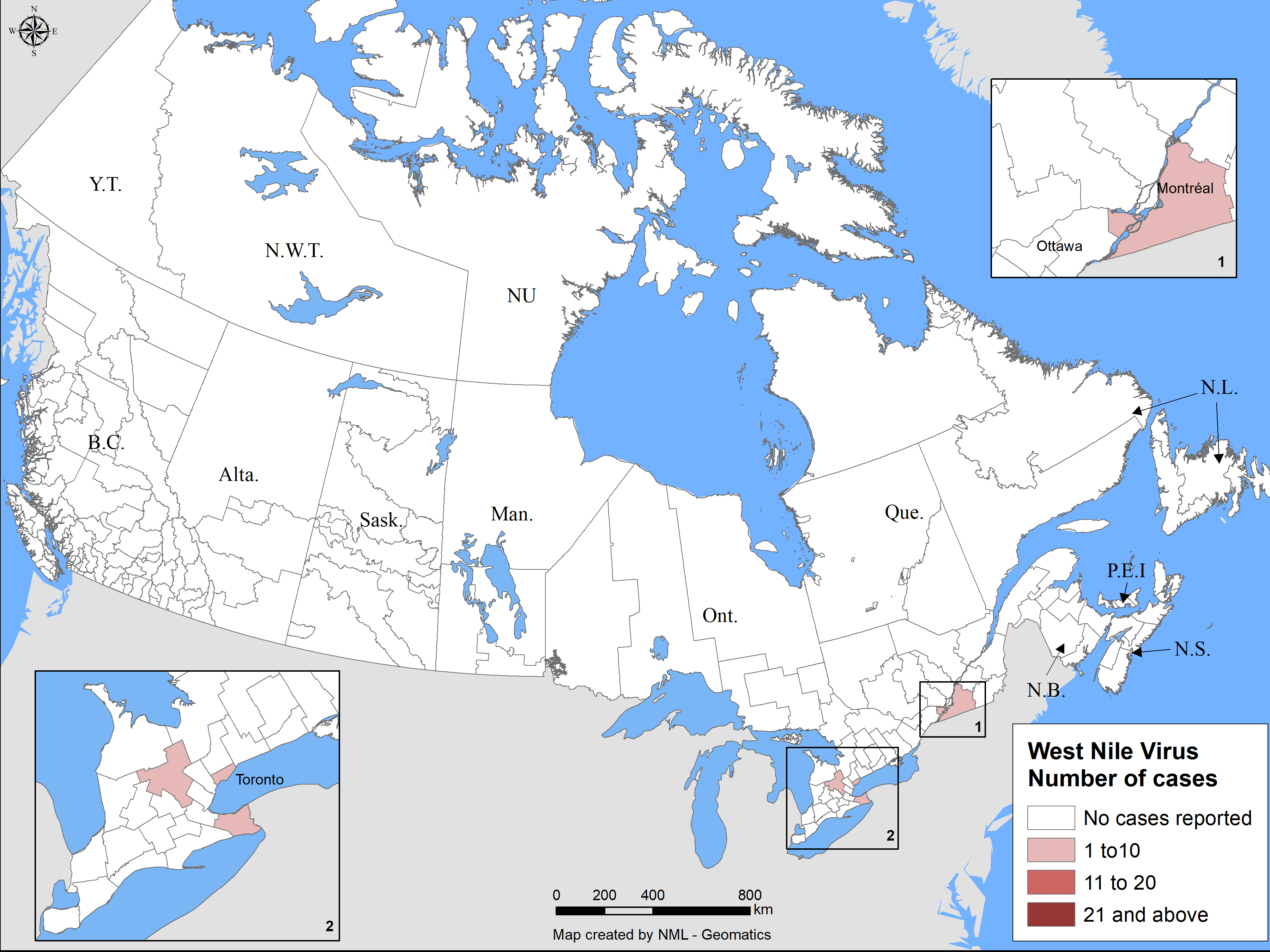 Figure 1. Geographic distribution of WNV human clinical cases and asymptomatic infections in Canada, 2019