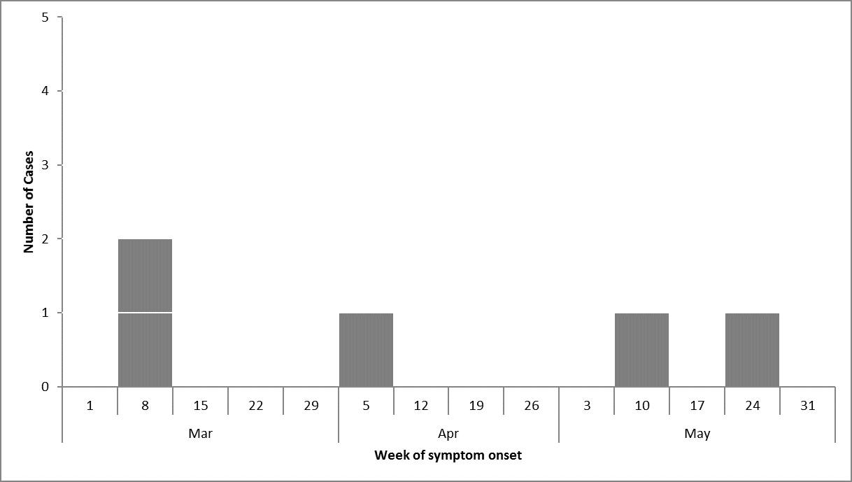 Figure 1 below is an epidemiological curve for this outbreak. Outbreak investigators use this information to show when illnesses begin, when they peak, and when they trail off. It can take several weeks from the time a person becomes ill to when the illness is reported and testing confirms a link to the outbreak. Data are available for 5 cases.