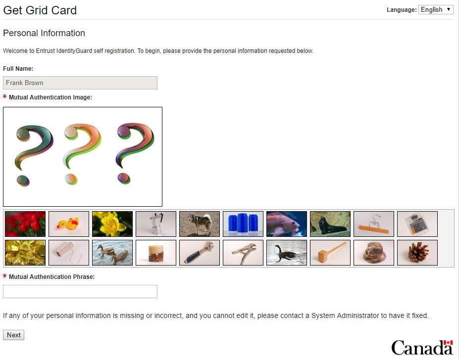 - From the Get Grid Card Self-Administration screen, select a mutual authentication image and a mutual Authentication phrase. Click on your chosen image (the selected image will replace the question marks). For the mutual authentication phrase, enter a phrase that you will remember.