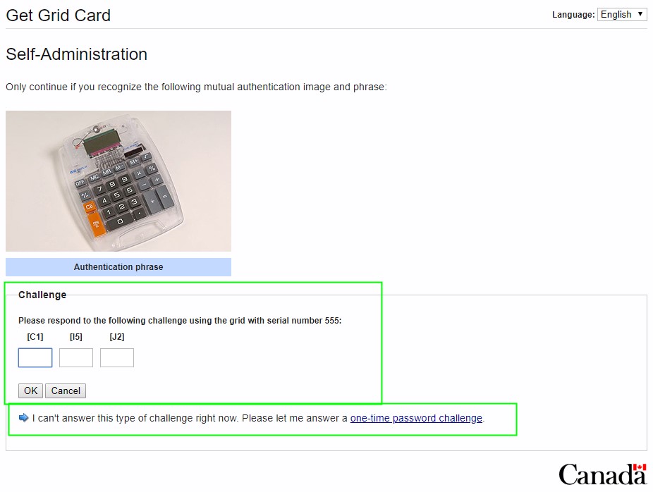 - From the Get Grid Card Self-Administration screen, click I can't answer this type of challenge right now. Please let me answer a one-time password challenge.