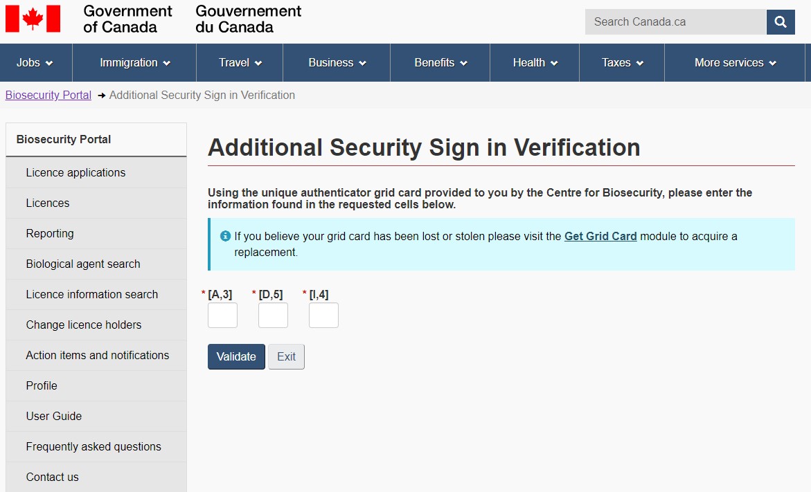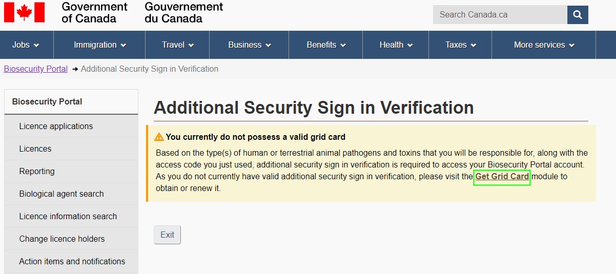 Additional security sign in verification is required for higher risk human or terrestrial animal pathogens and toxins. If you do not have a valid additional security sign in verification, you will need to visit the Get Grid Card module to obtain or renew your Grid Card.