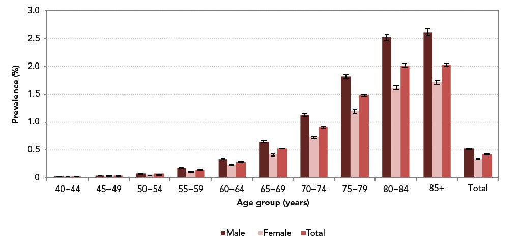 Figure 1: Prevalence (%) of diagnosed parkinsonism, including Parkinson’s disease, by sex and age group, Canada, 2013−2014