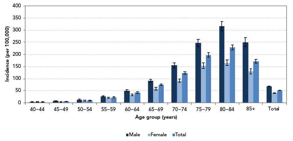 Figure 2: Incidence (per 100,000) of diagnosed parkinsonism, including Parkinson’s disease, by sex and age group, Canada, 2013−2014