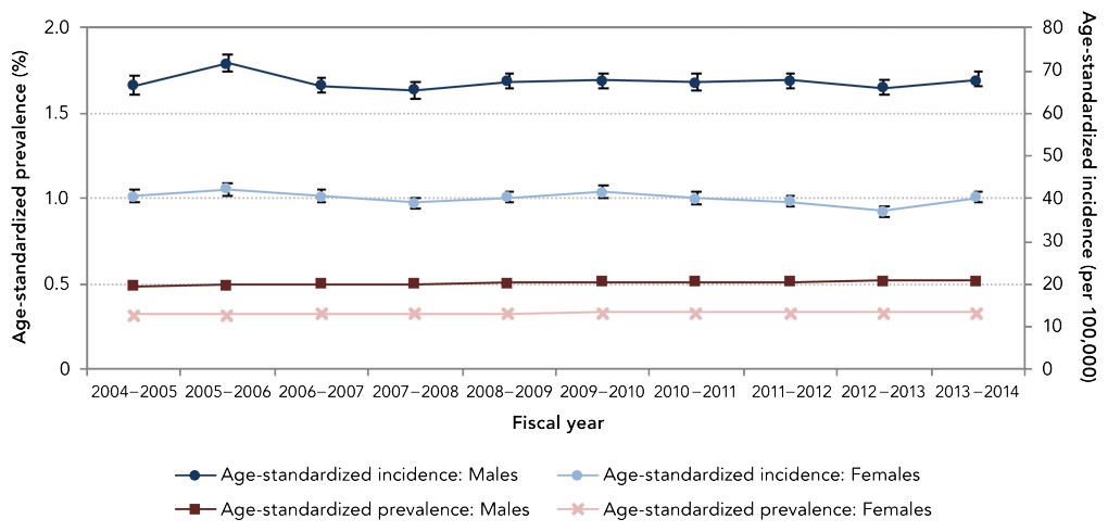 The data used in this publication are from the Canadian Chronic Disease Surveillance System (CCDSS), a collaborative network of provincial and territorial chronic disease surveillance systems, led by the Public Health Agency of Canada (PHAC). The CCDSS identifies chronic disease cases from provincial and territorial administrative health databases, including physician billing claims and hospital discharge abstract records, linked to provincial and territorial health insurance registry records using a unique personal identifier. Data on all residents eligible for provincial or territorial health insurance (about 97% of the Canadian population) are captured in the health insurance registries.