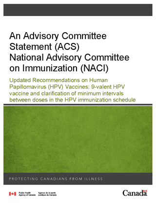 In February 2015, a nine-valent human papillomavirus vaccine (HPV9) (Gardasil®9, Merck Canada, Inc.) was authorized for use in Canada. The purpose of this statement is to summarize information on this vaccine and to provide evidence-based recommendations on its use in the context of recommendations for all HPV vaccines currently authorized for use in Canada. In addition, this statement will clarify minimum intervals between doses of HPV vaccines for two-dose and three-dose HPV immunization schedules.