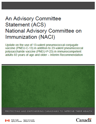 Since January 2012, PNEU-C-13 vaccine has been authorized for use in adults 50 years of age and older for the prevention of invasive pneumococcal disease (IPD) caused by Streptococcus pneumoniae serotypes included in the vaccine. In July 2015, PNEU-C-13 vaccine received an expanded adult indication for the prevention of community-acquired pneumonia (CAP) caused by the serotypes included in the vaccine. Previously published NACI Statements are available online. A summary of current NACI recommendations is provided in the Pneumococcal Vaccine chapter of the Canadian Immunization Guide.