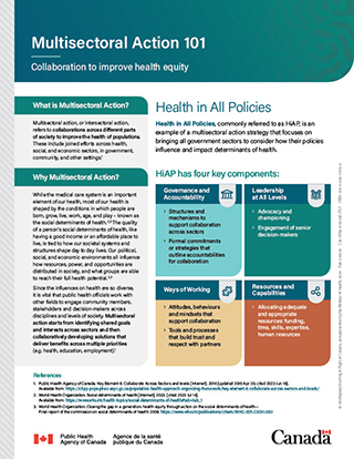 Multisectoral action, or intersectoral action, refers to collaborations across different parts of society to improve the health of populations. These include joined efforts across health, social, and economic sectors, in government, community, and other settings.Footnote 1