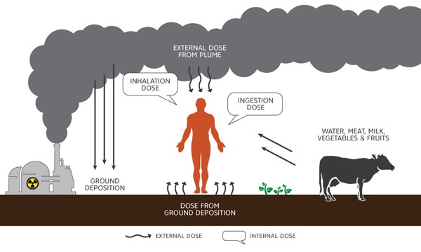 Since small but measurable increases in radionuclide concentrations originating from the Fukushima Daiichi accident entered Canadian airspace, it is possible to estimate small incremental increases in radiation dose. Generally, there are 4 major pathways of exposure to radiation in the environment [Figure 1]: