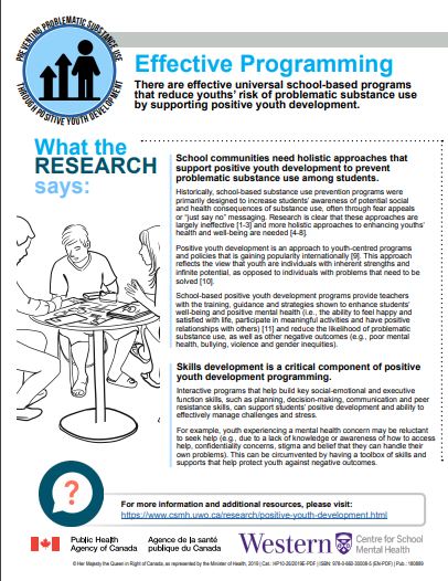 School-based positive youth development programs provide teachers with the training, guidance and strategies shown to enhance students' well-being and positive mental health (i.e., the ability to feel happy and satisfied with life, participate in meaningful activities and have positive relationships with others) Footnote 11 and reduce the likelihood of problematic substance use, as well as other negative outcomes (e.g., poor mental health, bullying, violence and gender inequities).