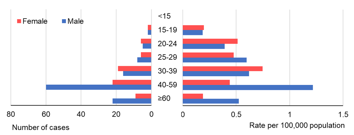 Since 2015, males 40 to 59 years old have had the highest acute hepatitis B rates. Since 2016, rates among females 30 to 39 years old have increased annually and were the highest reported in 2019.