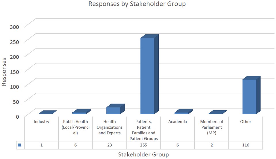 This figure shows stakeholder feedback broken down by stakeholder classification. This is a chart with vertical bars showing the number of responses received by stakeholder groups. There is one bar for each type of stakeholder. From left to right: 1 response from Industry, 6 responses from Public Health (Local and Provincial), 23 responses from Health organizations and Experts, 255 responses from Patients, Patient Families and Patient Groups, 6 responses from Academia, 2 responses from Members of Parliament (MP) and 116 responses from Other.