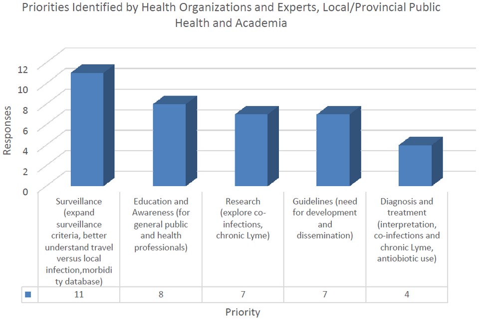 This figure shows the top five areas of focus, as identified by health organizations and experts, local and provincial public health, and academia. This is a chart with vertical bars showing the priorities identified by health organizations and experts, local and provincial public health, and academia. There is one bar for each identified priority (5 in total). From left to right: 11 respondents identified as a priority: Surveillance (expand surveillance criteria, better understand travel versus local infection, morbidity database), 8 respondents identified as a priority: Education and Awareness (for general public and health professionals), 7 respondents identified as a priority: Research (explore co-infections, chronic Lyme), 7 respondents identified as a priority: Guidelines (need for development and dissemination) and 4 respondents identified as a priority: Diagnosis and treatment (interpretation, co-infection and chronic Lyme, antibiotic use).