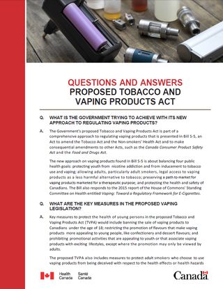 A. The Government’s proposed Tobacco and Vaping Products Act is part of a comprehensive approach to regulating vaping products that is presented in Bill S-5, an Act to amend the Tobacco Act and the Non-smokers’ Health Act and to make consequential amendments to other Acts, such as the Canada Consumer Product Safety Act and the Food and Drugs Act.