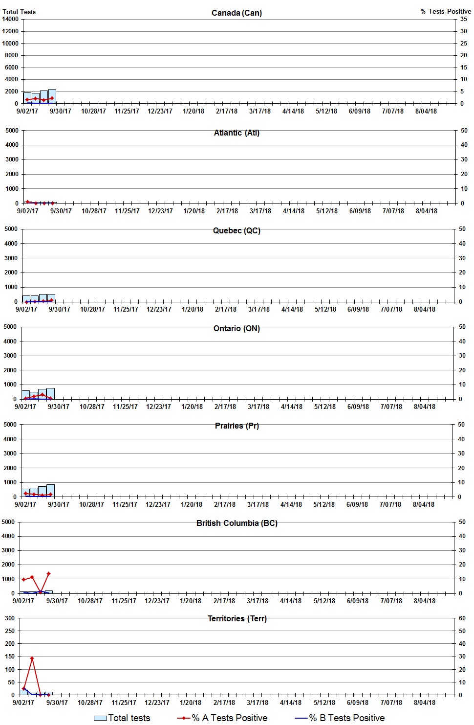 | Week | Week end | Can Tests | Can A% | Can B% | At Tests | At A% | At B% | QC Tests | QC A% | QC B% | ON Tests | ON A% | ON B% | Pr Tests | Pr A% | Pr B% | BC Tests | BC A% | BC B% | Terr Tests | Terr A% | Terr B% |