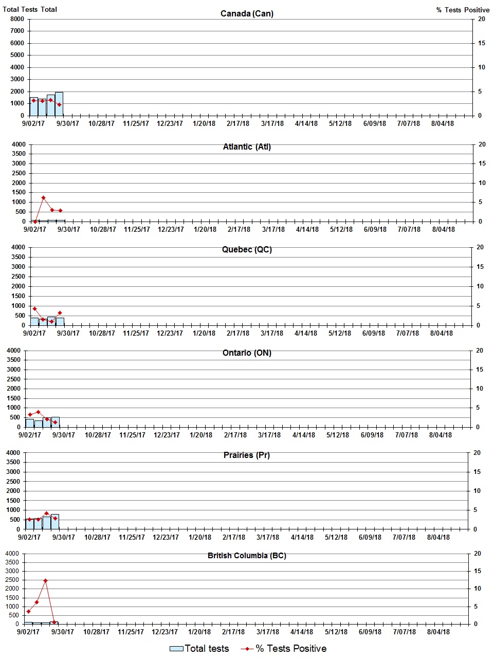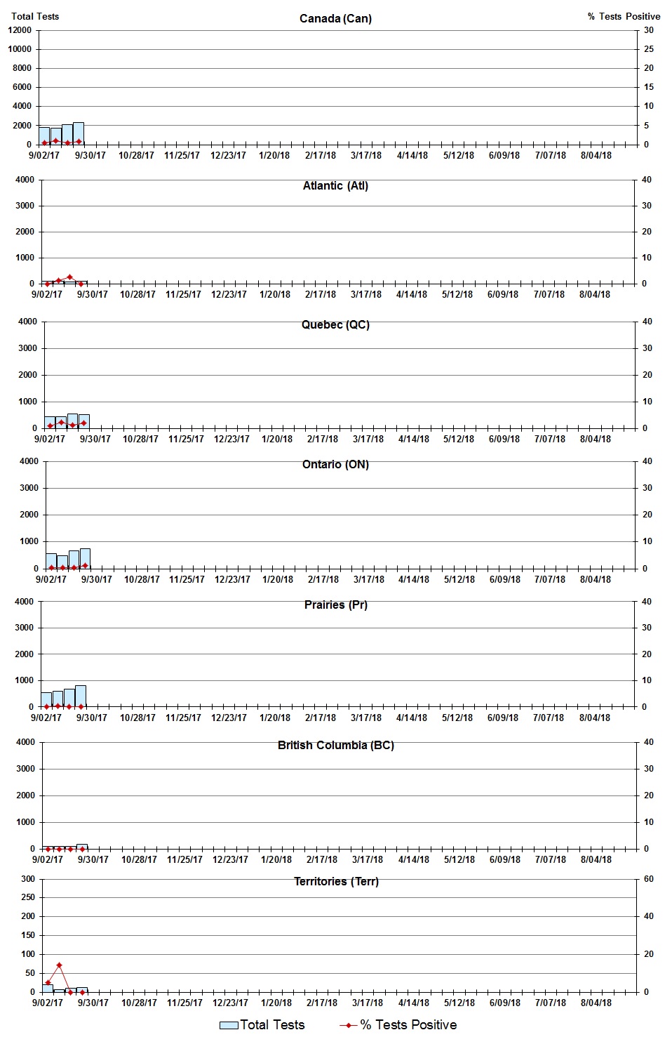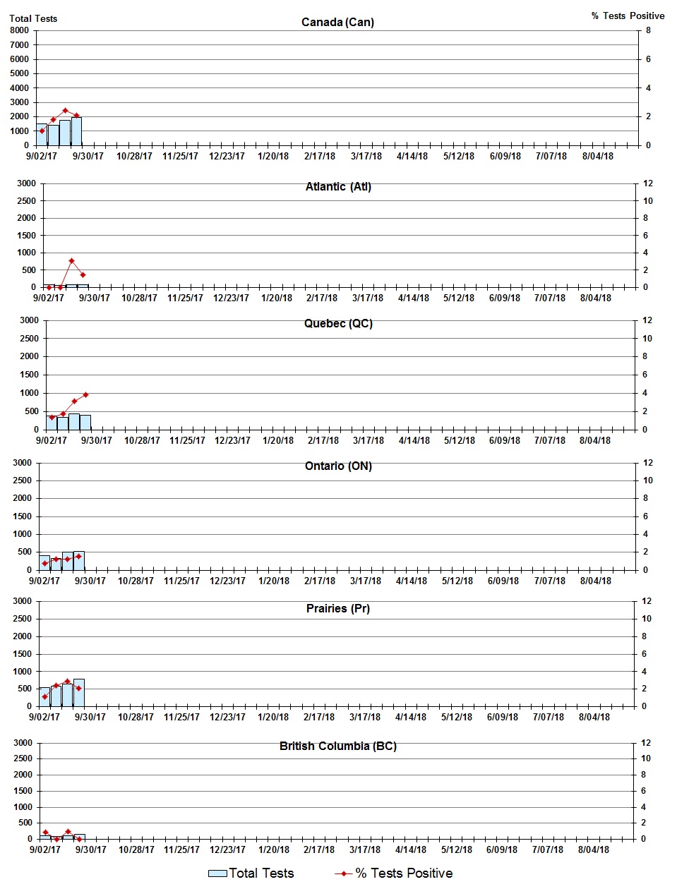 Specimens from Yukon (YT), Northwest Territories (NT) and Nunavut (NU) are sent to reference laboratories in other provinces and reported results reflect specimens identified as originating from YT, NT or NU. |