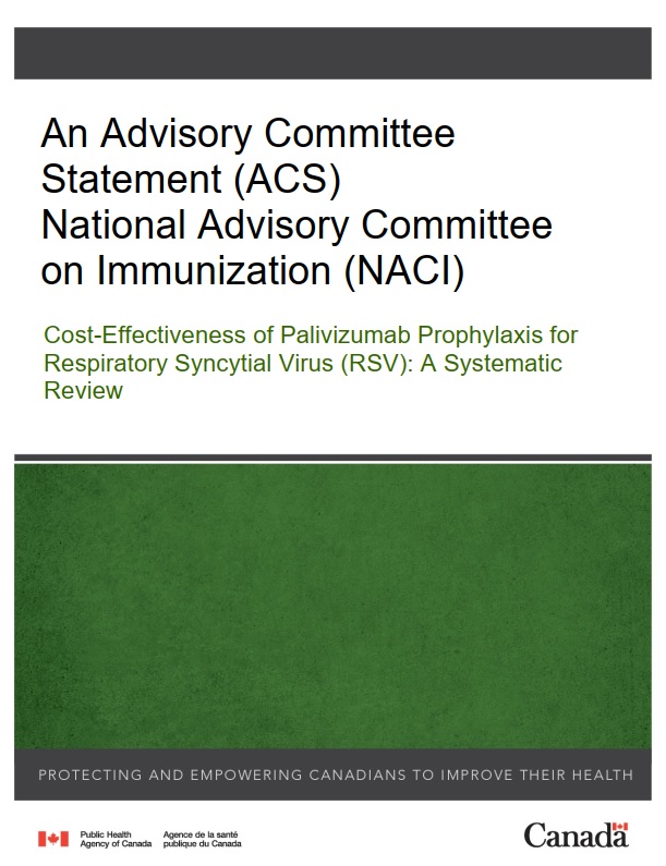 This systematic review was completed to inform the National Advisory Committee on Immunization's evidence-informed recommendations on PVZ prophylaxis for RSV, which are presented in the NACI Statement entitled "Recommended Use of Palivizumab to Reduce Complications of Respiratory Syncytial Virus Infection in Infants" published on June 1, 2022. The original systematic review was published in the journal of Pediatrics in 2019 Footnote 19. For the purposes of this NACI supplement, changes were made to the reporting and discussion of the original review to meet the needs of NACI's decision-making, including having currency reported in CAD, a section on Canadian studies, alternate subgroups reported, and additional commentary.