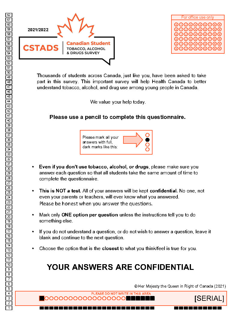 Thousands of students across Canada, just like you, have been asked to take part in this survey. This important survey will help Health Canada to better understand tobacco, alcohol, and drug use among young people in Canada.