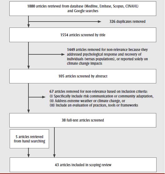 This figure illustrates a flow diagram in which 1880 were articles retrieved from database (Medline, Embase, Scopus, CINAHL) and Google searches. 326 of these articles were duplicates and thus removed. The remaining 1554 articles were screened by title and from those, 1449 articles were removed for non-relevance because they addressed psychological response and recovery of individuals (versus populations), or reported solely on climate change impacts. The remaining 105 articles were screened by abstract, of which 67 articles were removed for non-relevance based on inclusion criteria. The inclusion criteria were: (i) specifically include risk communication or community adaptation; (ii) addressing extreme weather or climate change; and (iii) include an evaluation of practices, tools or frameworks. The remaining 38 full-text articles were screened, as well as an additional 5 articles that were also retrieved from hand searching, for a total of 43 articles included in the scoping review.