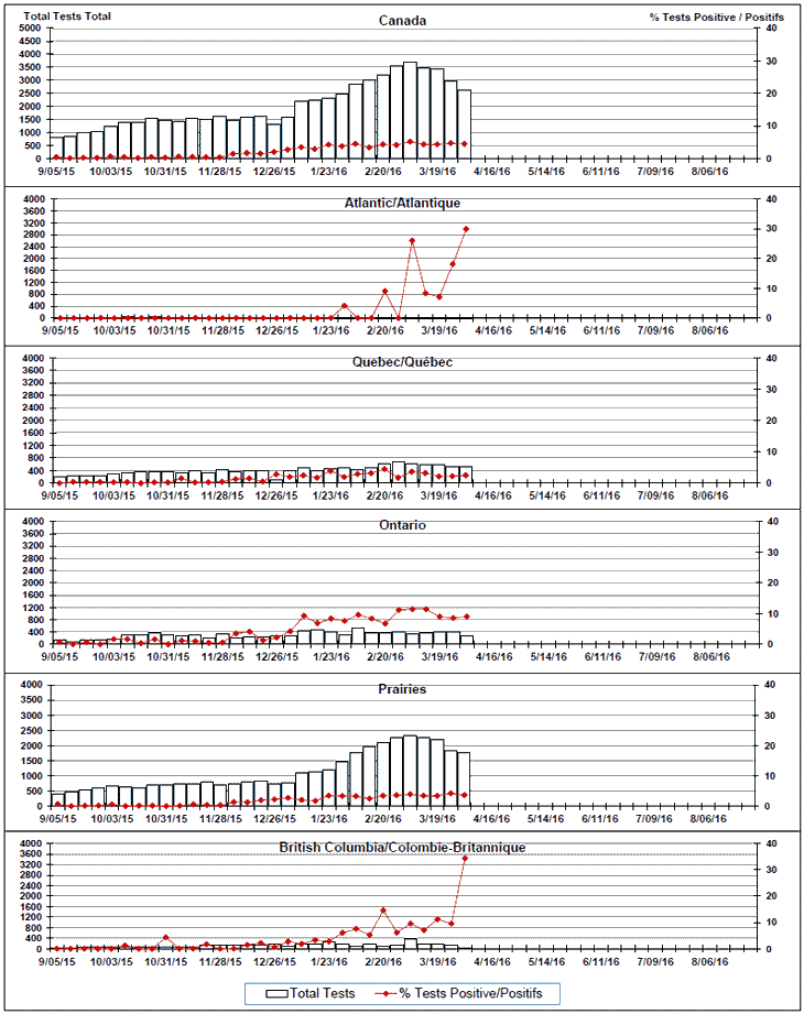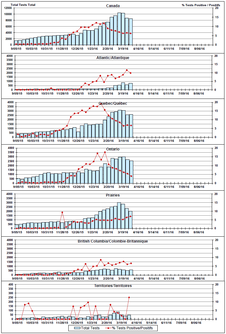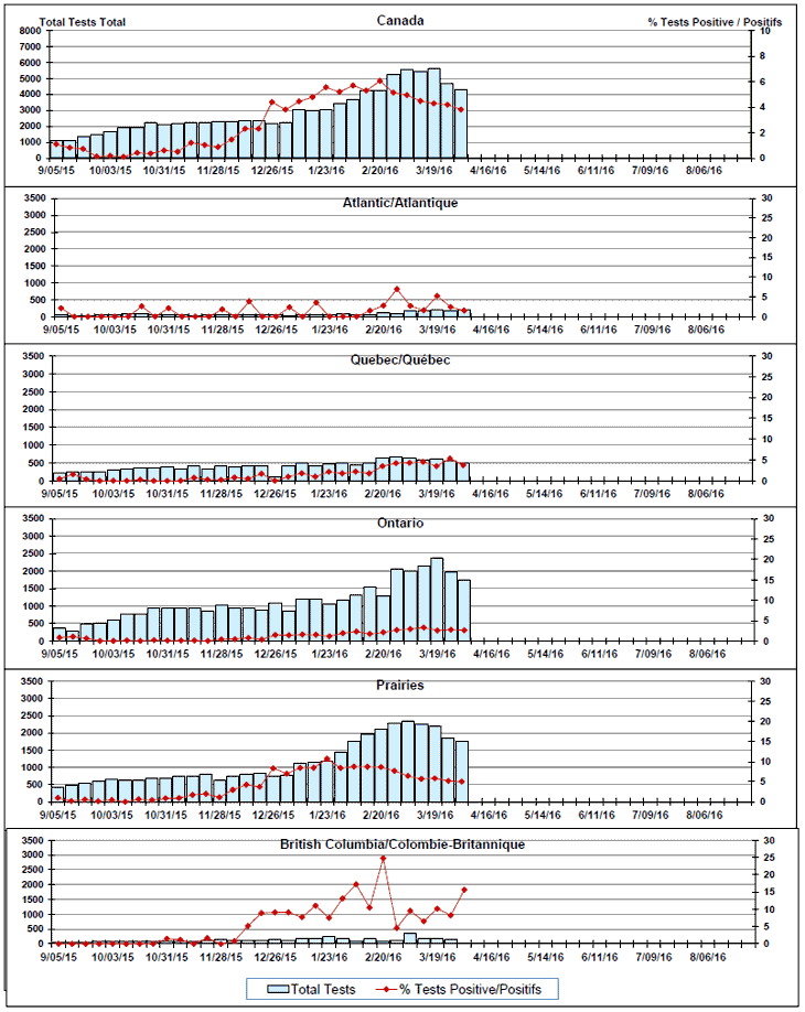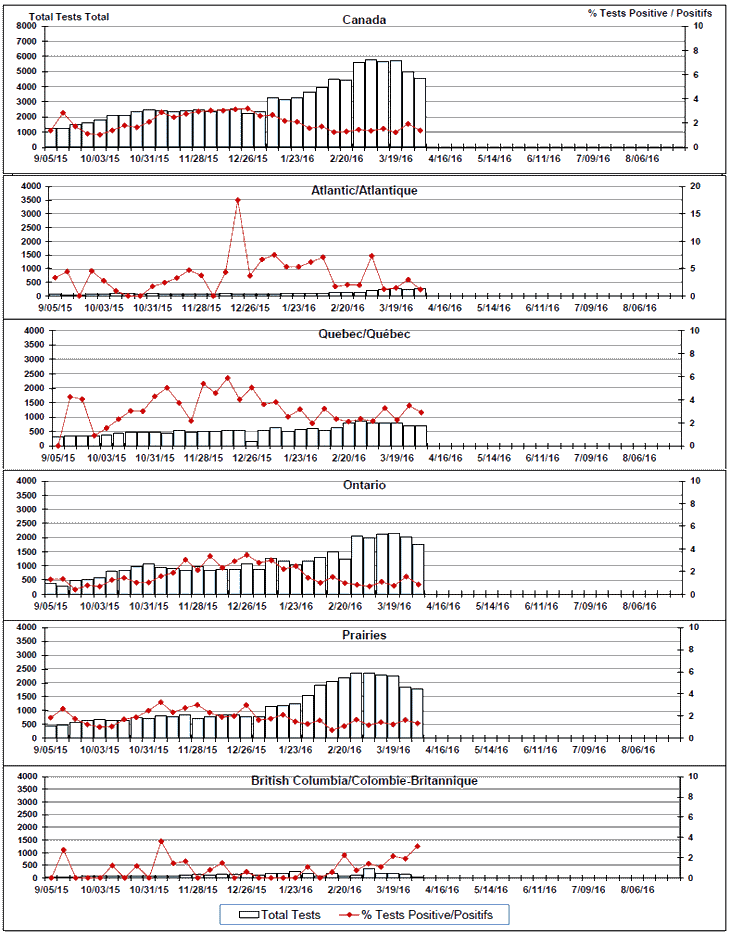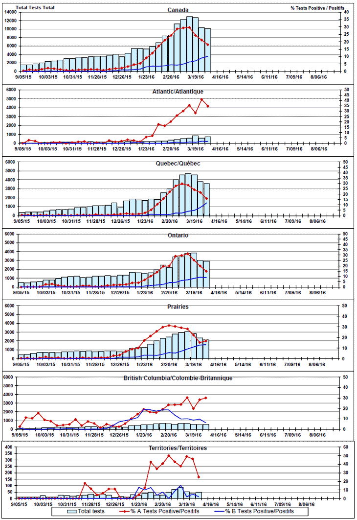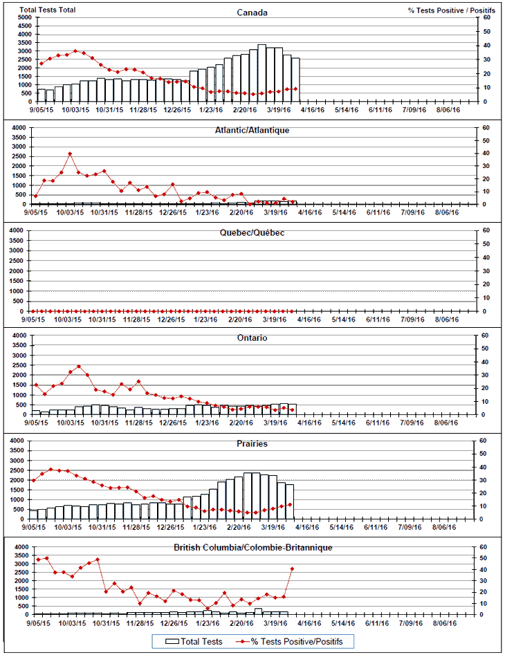 Respiratory Virus Detections/Isolations in Canada, Week 13, ending April 2, 2016