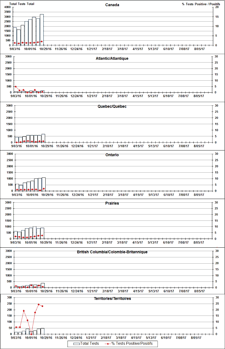 Specimens from YT, NT and NU are sent to reference laboratories in other provinces and reported results reflect specimens identified as originating from YT, NT or NU. |