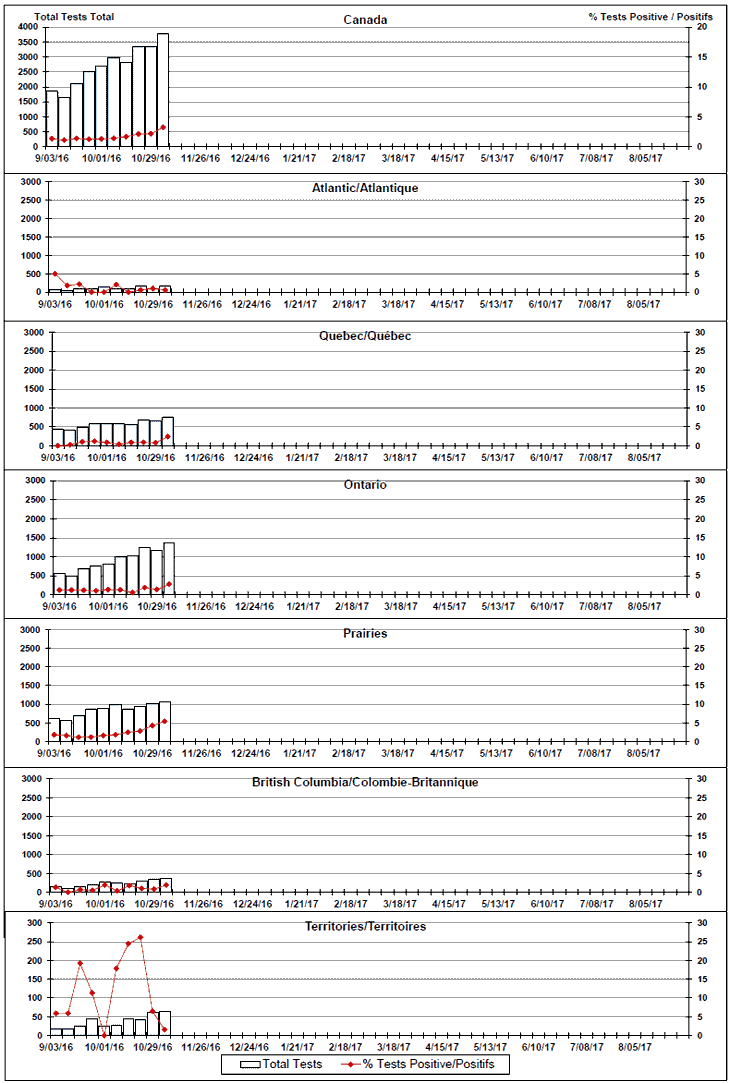 Specimens from YT, NT and NU are sent to reference laboratories in other provinces and reported results reflect specimens identified as originating from YT, NT or NU. |