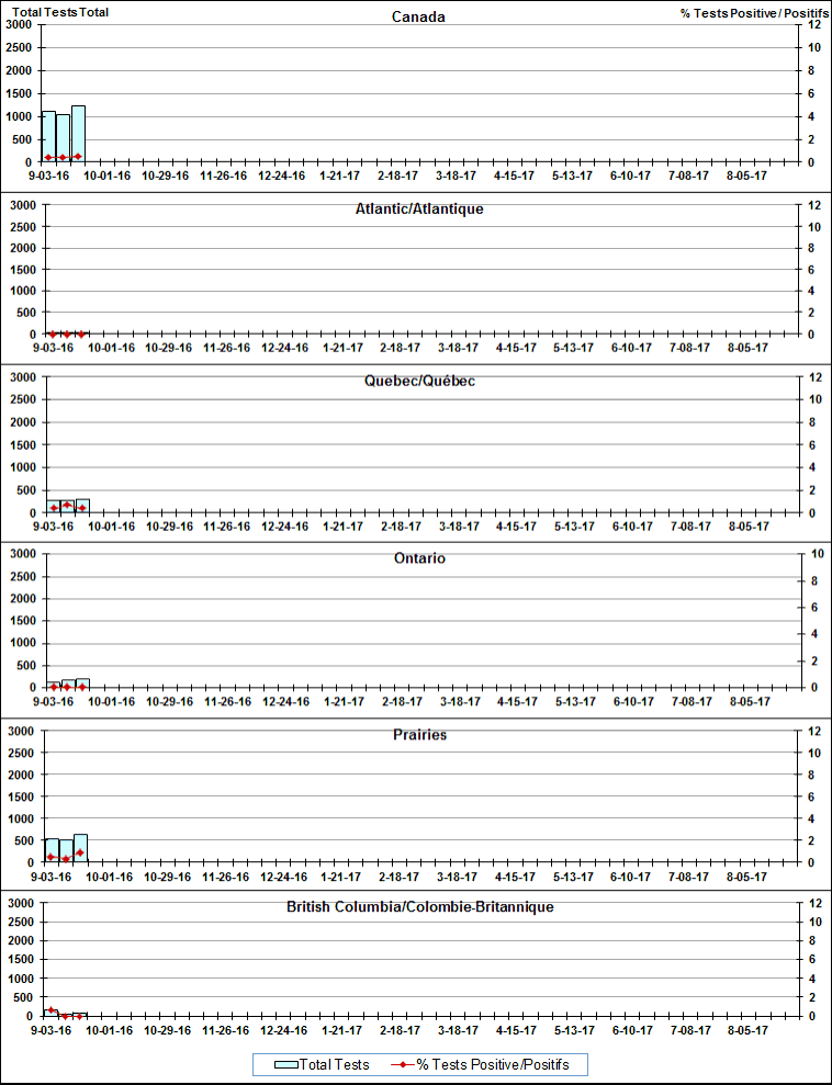Specimens from YT, NT and NU are sent to reference laboratories in other provinces and reported results reflect specimens identified as originating from YT, NT or NU. |