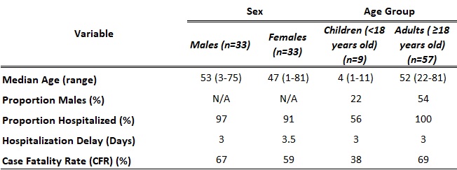 | Males (n=33) | Females (n=33) | Children (<18 years old) (n=9) | Adults (≥18 years old) (n=57) | |