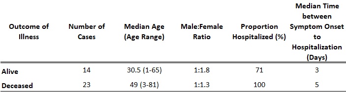 Note: 29 males, 32 females, 9 children, and 52 adults had available hospitalization data, with 28 males, 29 females, 5 children, and 52 adults reporting history of hospitalization. Hospitalization delay refers to the median number of days from symptom onset to hospitalization, for hospitalized cases that also had available symptom onset and hospitalization date data (23 males, 26 females, 4 children, and 45 adults). Fifteen males, 22 females, 8 children, and 29 adults had final outcome data that were used to determine CFRs. Missing outcome information may affect the CFR of reported groups. This table contains data on cases reported from 2014 to January 31, 2022.