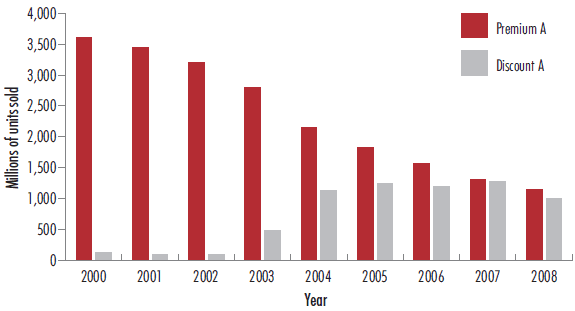 Bar chart showing total unit wholesale sales for a premium and a discount brand from 2000 to 2008.
