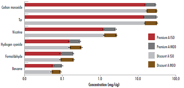 Health Canada compared discount and premium cigarettes and found that the same chemicals are present in the smoke of both types of cigarettes. The amount of six significant chemicals is shown in Figure 2. Comparable amounts of these chemicals are found in the smoke of discount and premium cigarettes.