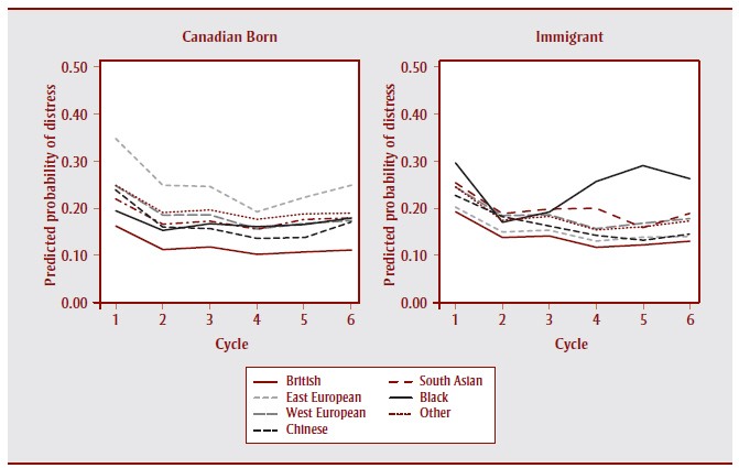 The predicted probability of moderate/high mental distress was slightly higher for immigrant versus Canadian-born respondents of all except Black ethnicity and the overall pattern of the longitudinal trend was similar for all immigrants of different ethnic groups except immigrants of Black ethnicity. See also Table 3.