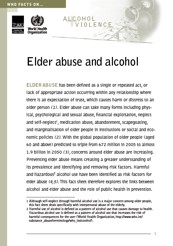 ELDER ABUSE has been defined as a single or repeated act, or lack of appropriate action occurring within any relationship where there is an expectation of trust, which causes harm or distress to an older person (1). Elder abuse can take many forms including physical, psychological and sexual abuse, financial exploitation, neglect and self-neglect1, medication abuse, abandonment, scapegoating, and marginalisation of older people in institutions or social and economic policies (2). With the global population of older people (aged 60 and above) predicted to triple from 672 million in 2005 to almost 1.9 billion in 2050 (3), concerns around elder abuse are increasing. Preventing elder abuse means creating a greater understanding of its prevalence and identifying and removing risk factors. Harmful and hazardous2 alcohol use have been identified as risk factors for elder abuse (4,5). This fact sheet therefore explores the links between alcohol and elder abuse and the role of public health in prevention.