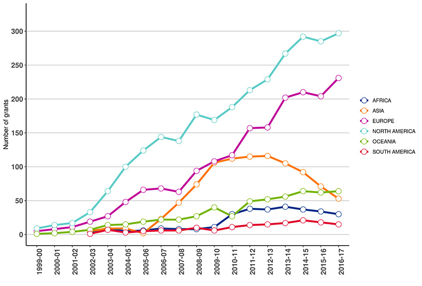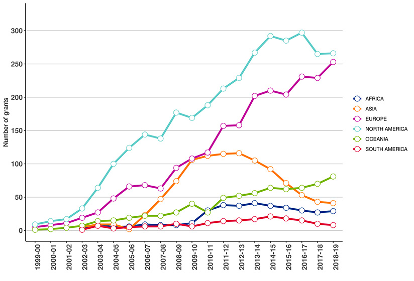 • As of March 2021, an updated method is used to determine international collaborators based on affiliations at the time of grant submission.