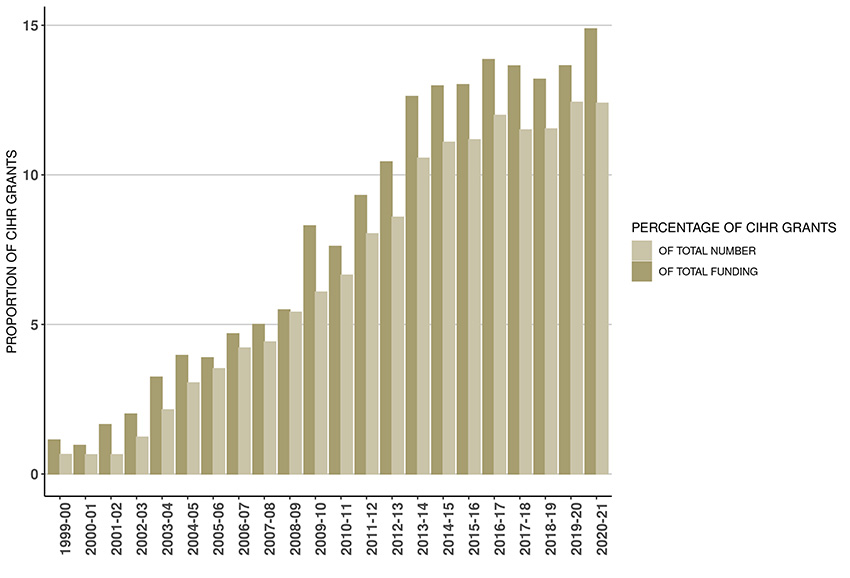 Percentage of total CIHR 1.1% 1.0% 1.7% 2.0% 3.2% 4.0% 3.9% 4.7% 5.0% 5.5% 8.3% 7.6% 9.3% 10.4% 12.6% 13.0% 13.0% 13.9% 13.6%