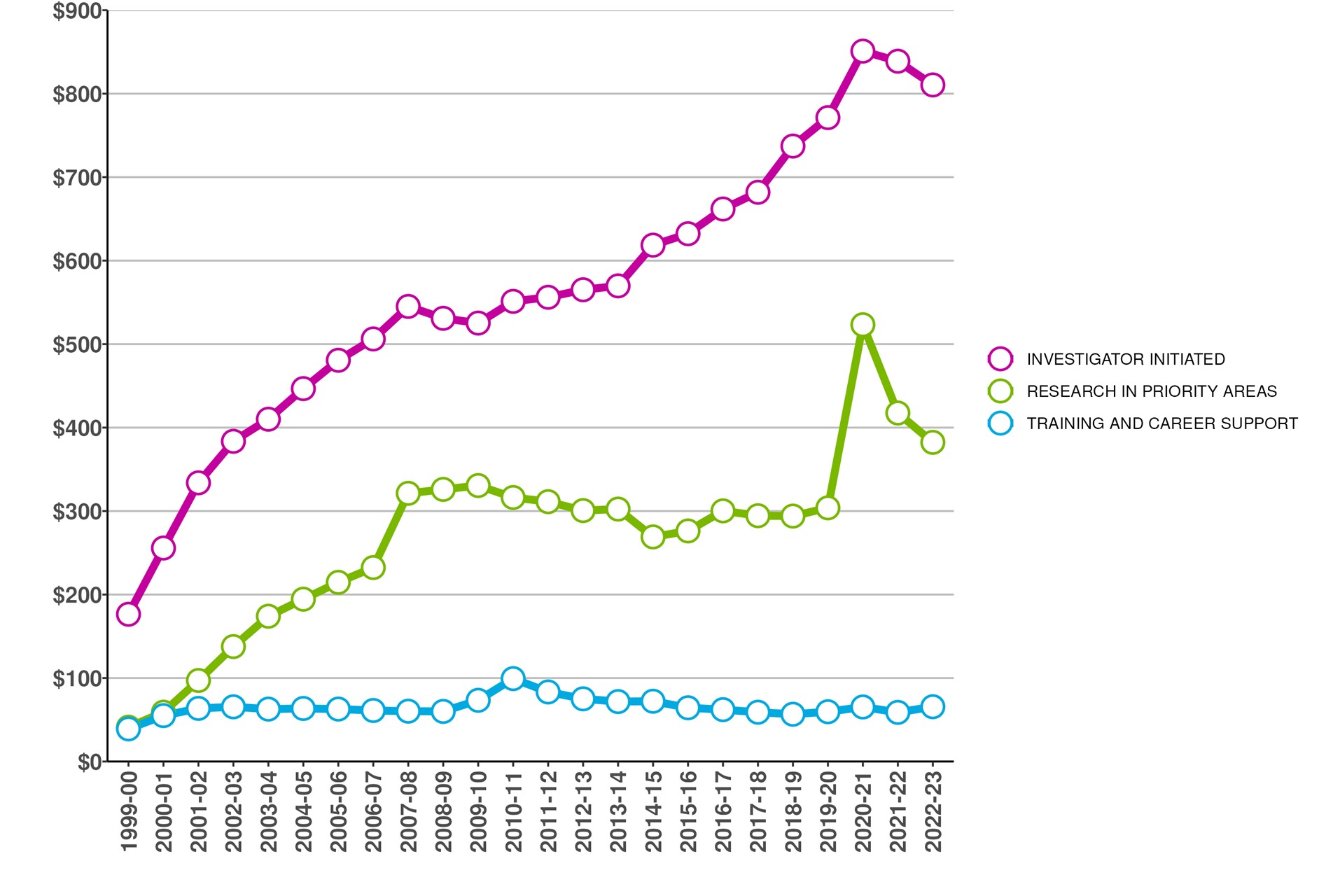 Figure 3: CIHR Fiscal Year Investments by Funding Type since 2000-01 (in millions of dollars)