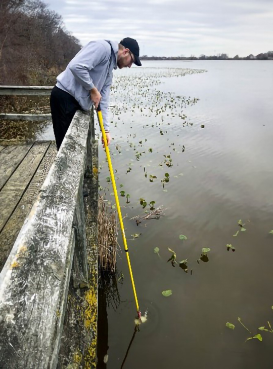 Faculty of Science Master's student Cameron Chevalier collecting a water sample at Point Pelee National Park. (Photo: H. Priebe)