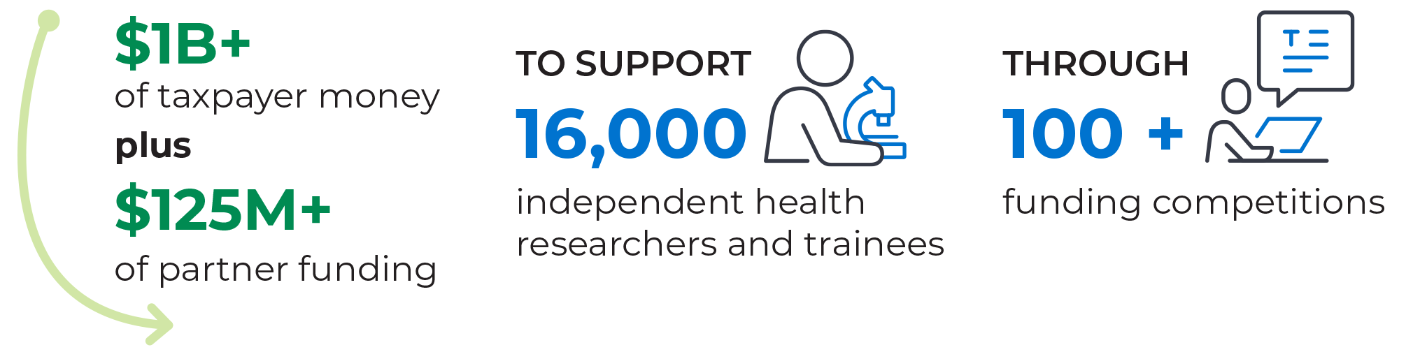 $1B+ of taxpayer money plus $125M+ of partner funding to support 16,000 independent health researchers and trainees through 100+ funding competitions.