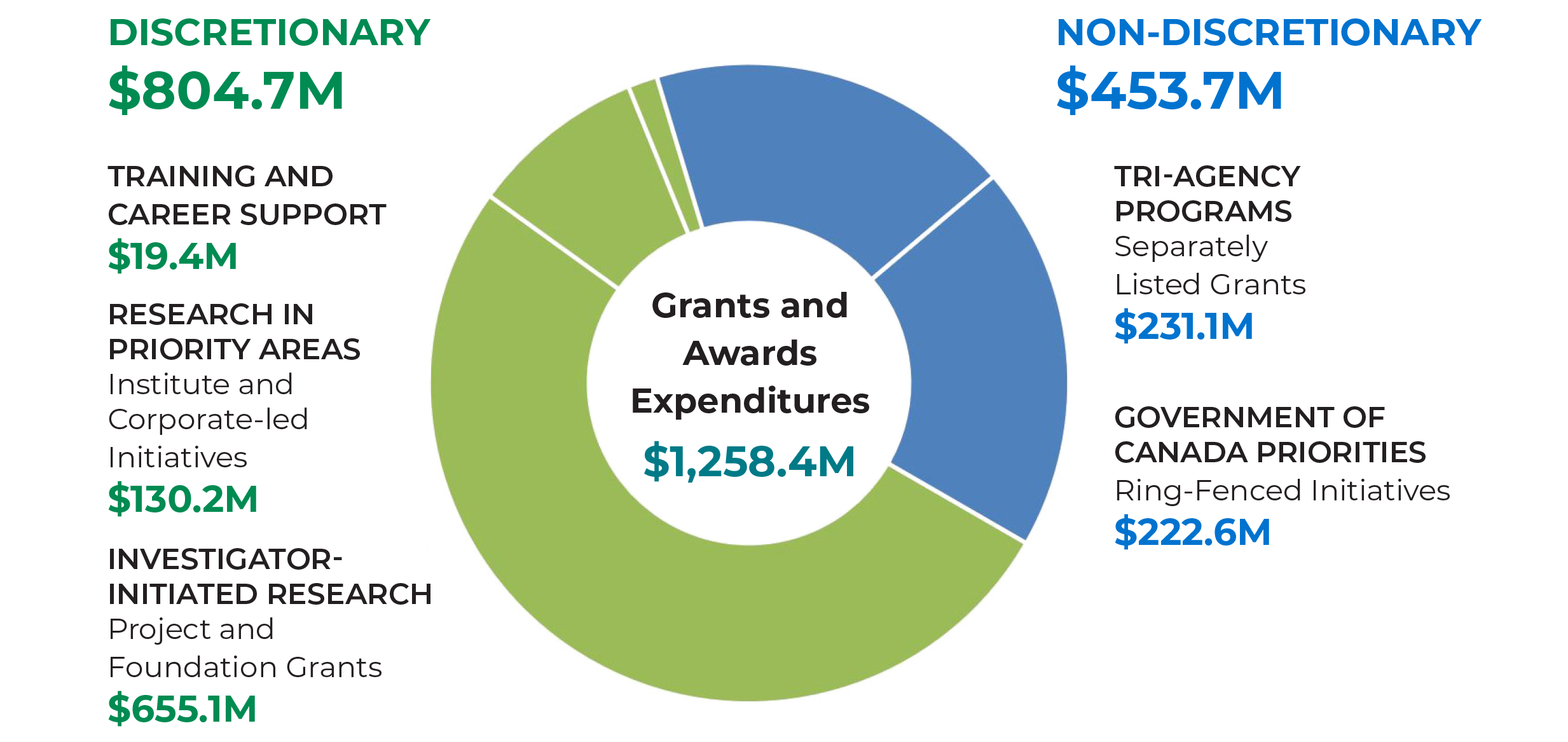 Each year, CIHR's grants and awards expenditures are divided into two main categories to reflect CIHR's financial management investment flexibility in its programs: