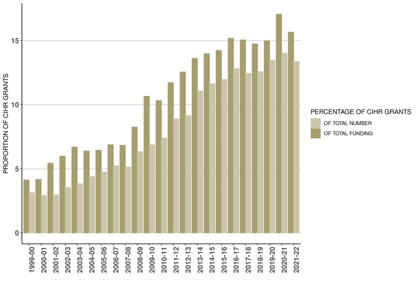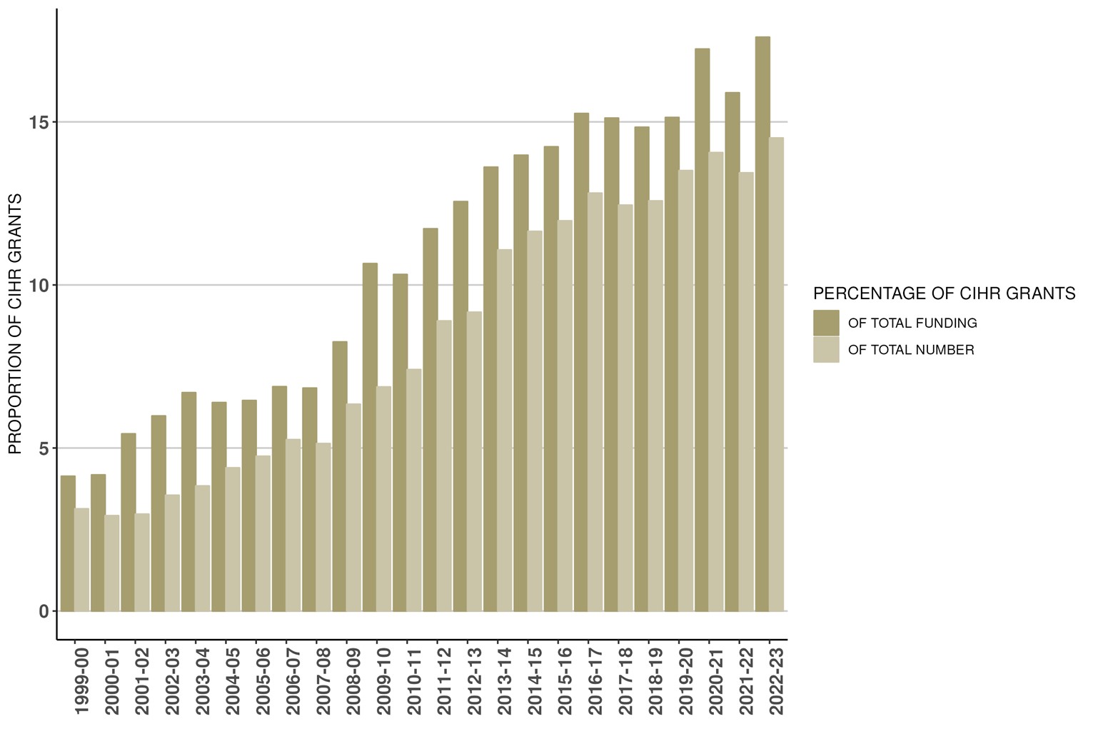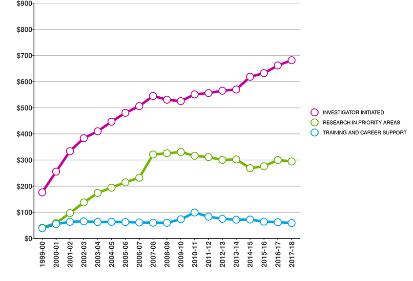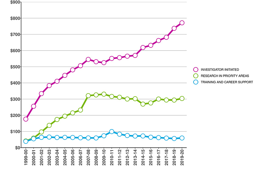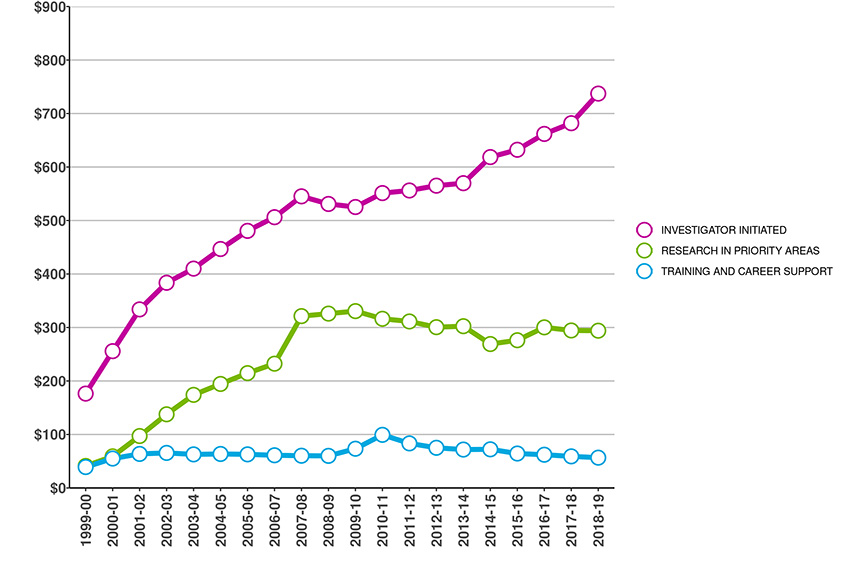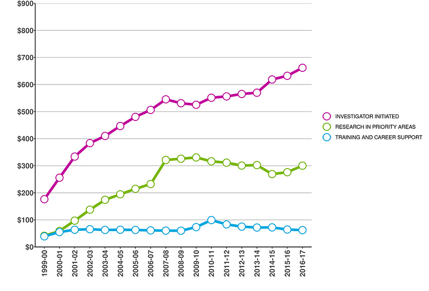 The following graphs provide a breakdown of CIHR's investments. For this year and henceforth, the information presented does not include data that precedes CIHR's formation in the 2000-2001 fiscal year.