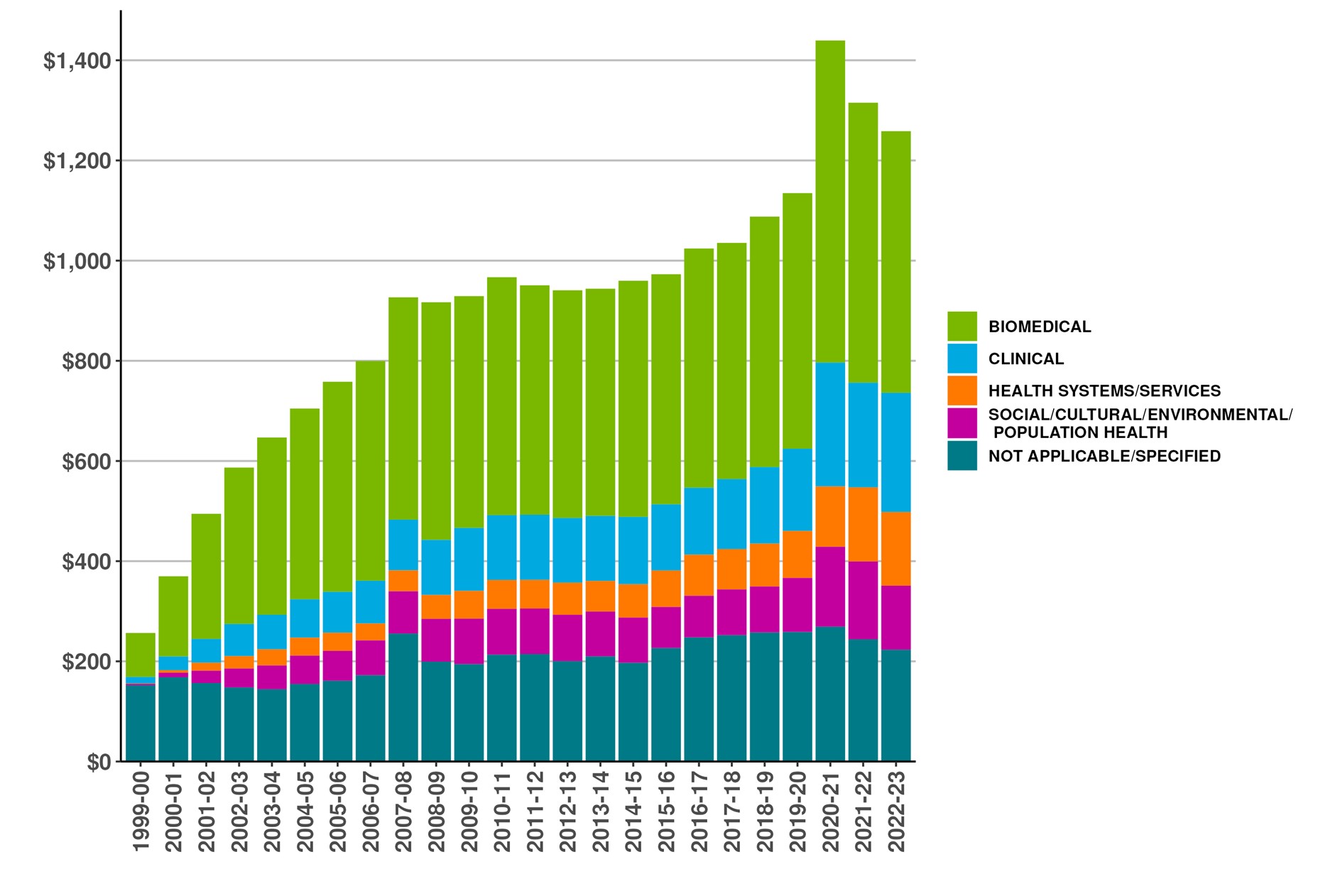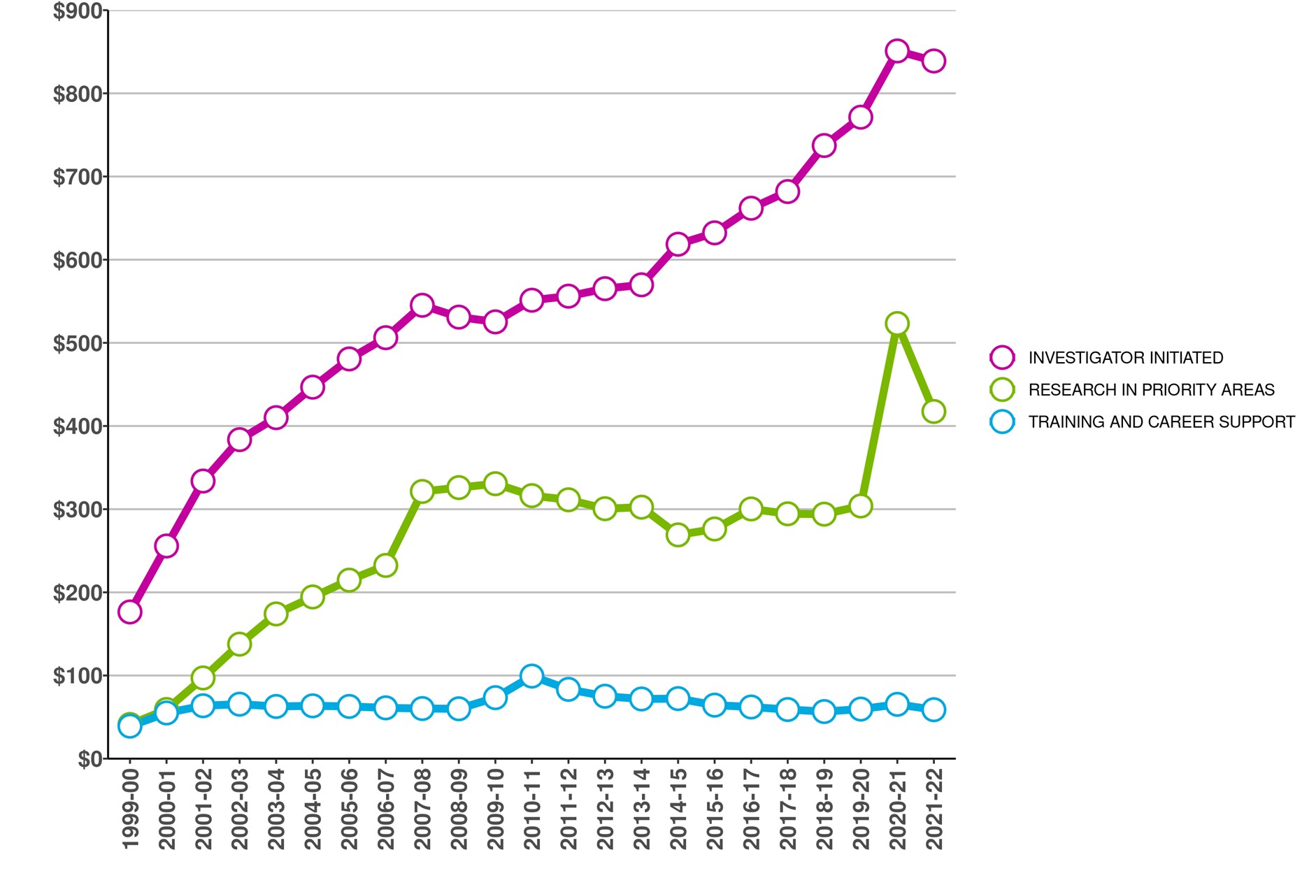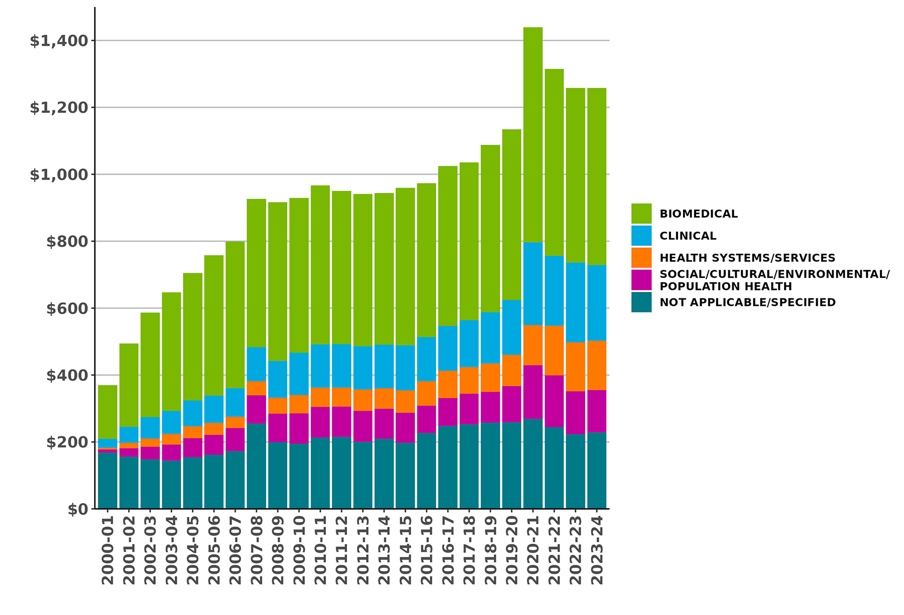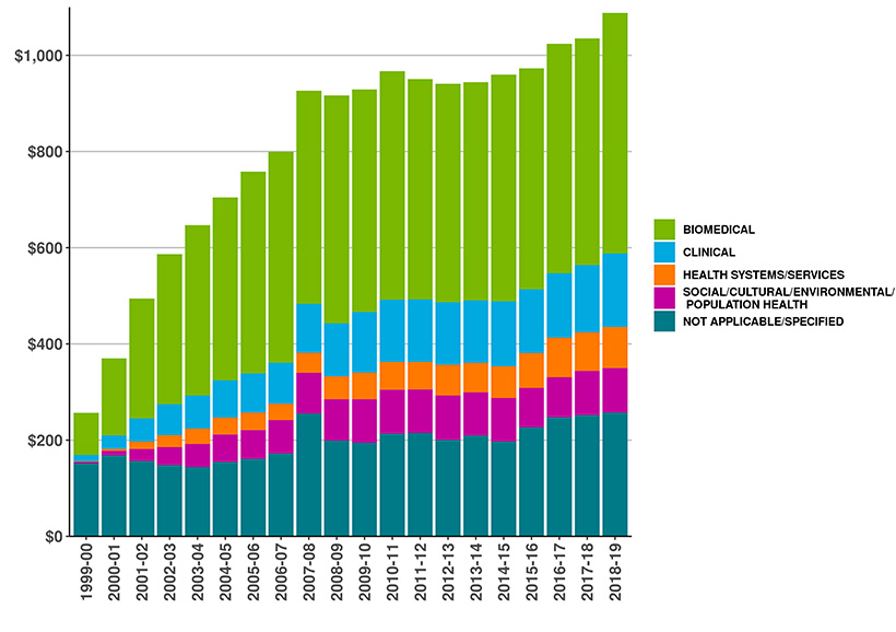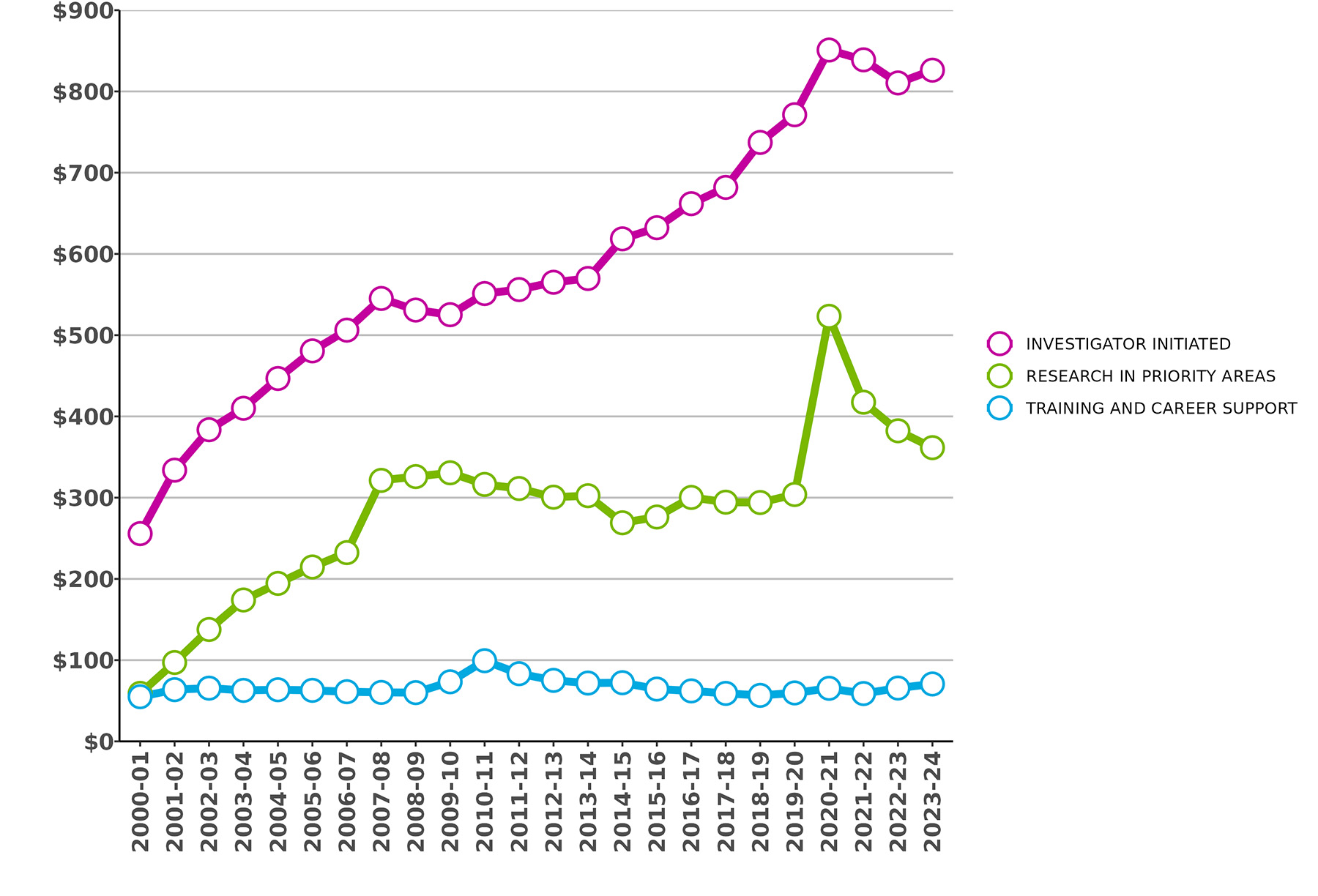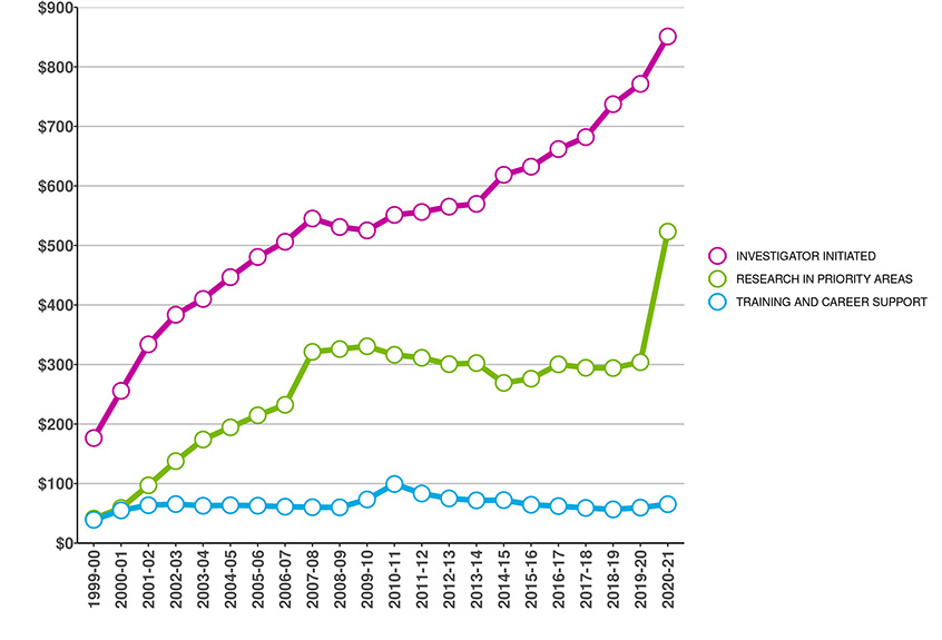 Figure 1: CIHR Fiscal Year Investments by Primary Theme since 2000-01 (in millions of dollars)