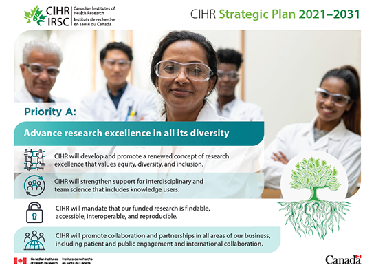 Advance research excellence in all its diversity: In 10 years... Canadian health research will be internationally recognized as inclusive, collaborative, transparent, culturally safe, and focused on real world impact.