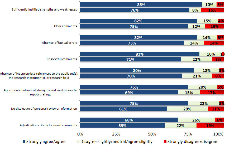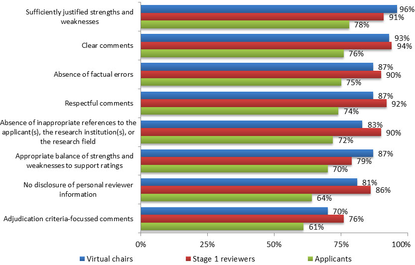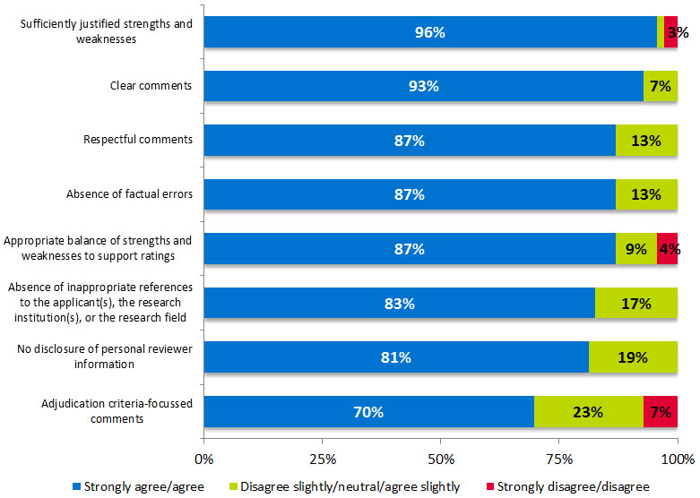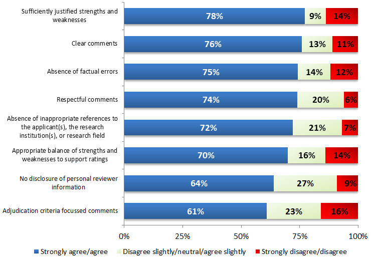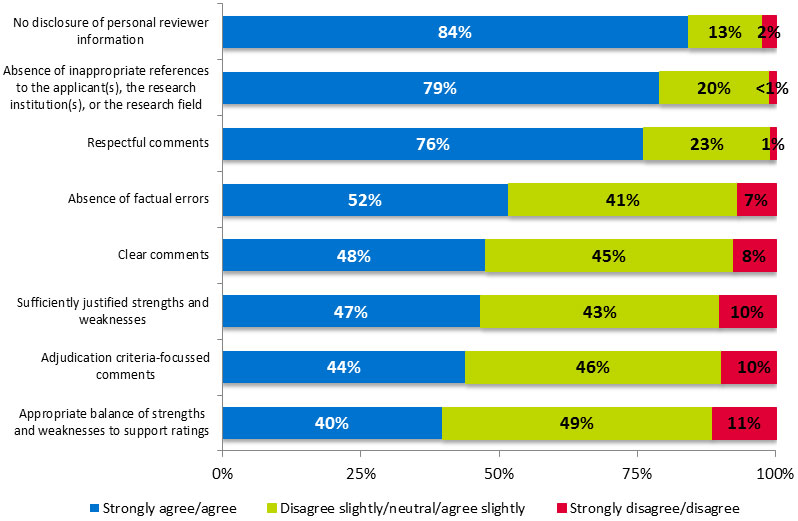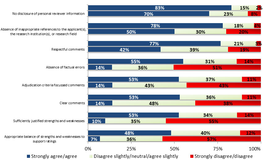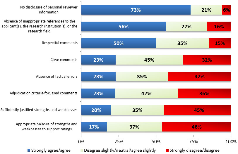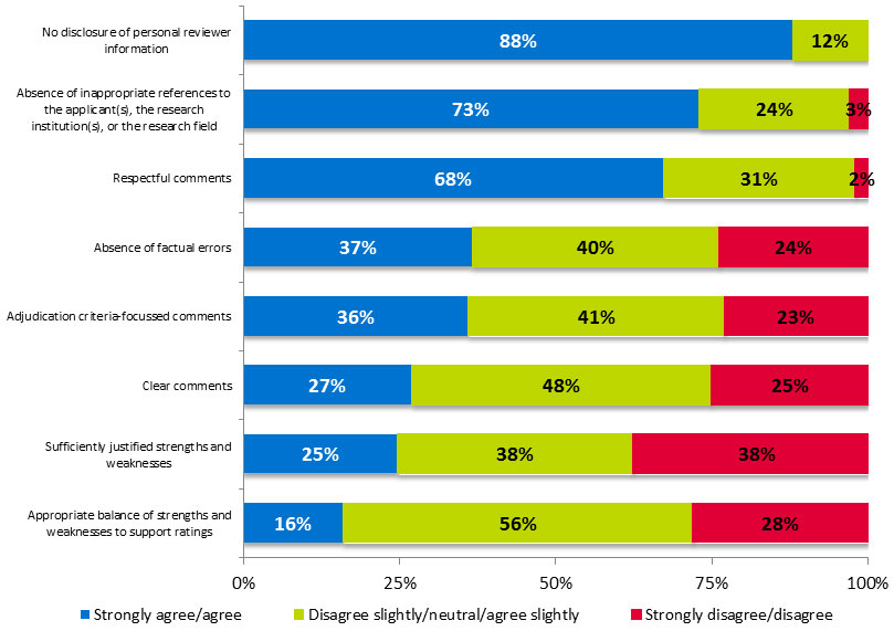 | Absence of inappropriate references to the applicant(s), the research institution(s) or research field | Stage 1 reviewers (n=629) | 187 (29.7%) |