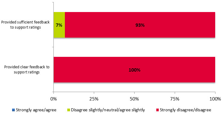 The majority of applicants (55%) disagreed or strongly disagreed that the written reviews they received at stage 1 were consistent with the rating they received (O++, O+, O, E++, E+, E, G, F, P). In contrast, 20% of applicants agreed or strongly agreed that the written reviews from stage 1 aligned with the rating given.