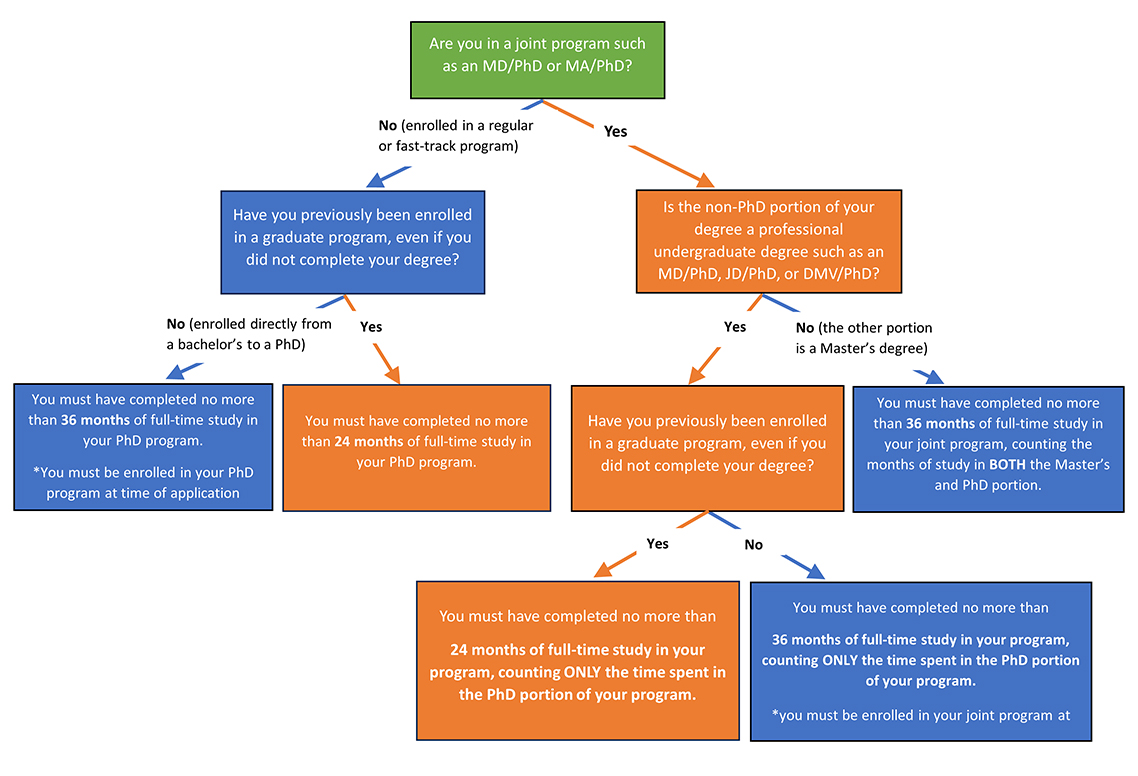 If “No”,then “You must have completed no more than 36 months of full-time study in your program, counting ONLY the time spent in the PhD portion of your program. *You must be enrolled in your joint program at the time of application.”