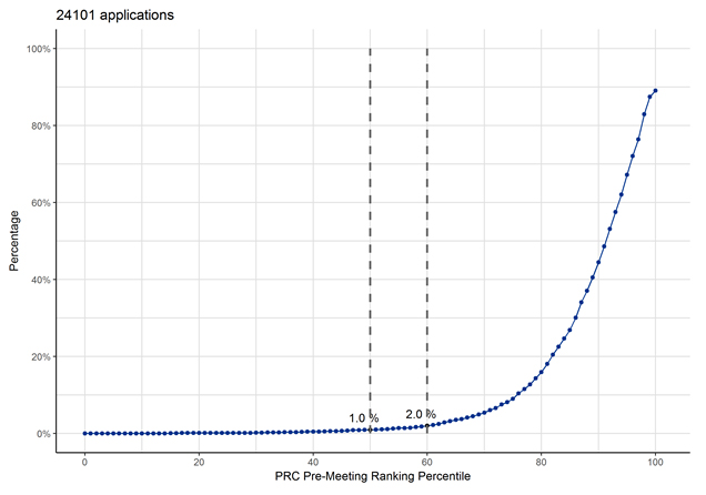 The blue graph line represents the percentage of applications that were funded after PRC discussions that are not captured within a bracket from the given percentile to the top ranked application.