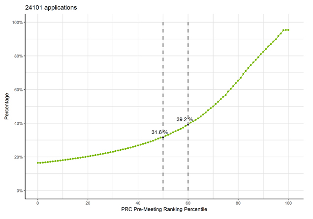 | Pre-Meeting Ranking Percentile | Percentage of Applications Ultimately Approved after PRC Discussion |